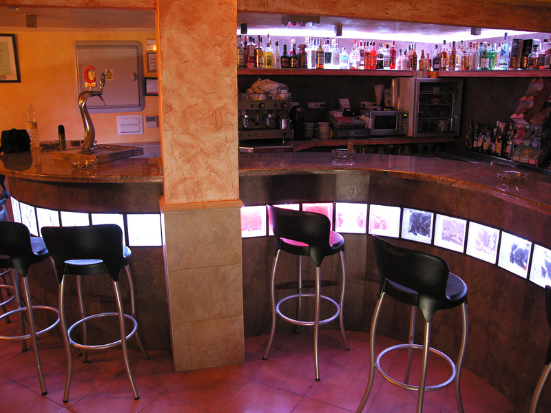 Barra completa. Leds en azul y halógenos+apliques regulados tenue.